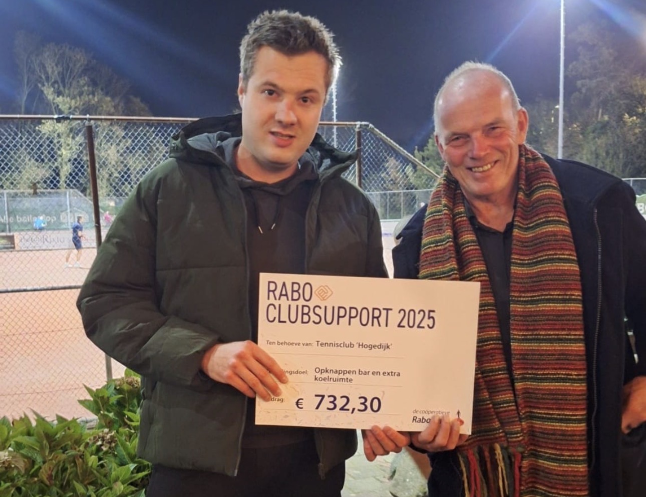 Vorige week kwam Erik de Waard namens de Rabobank langs om persoonlijk de cheque (€732,30) van de actie Rabo ClubSupport te overhandigen aan Sander van Tol, de pennjngmeester van TC Hogedijk.