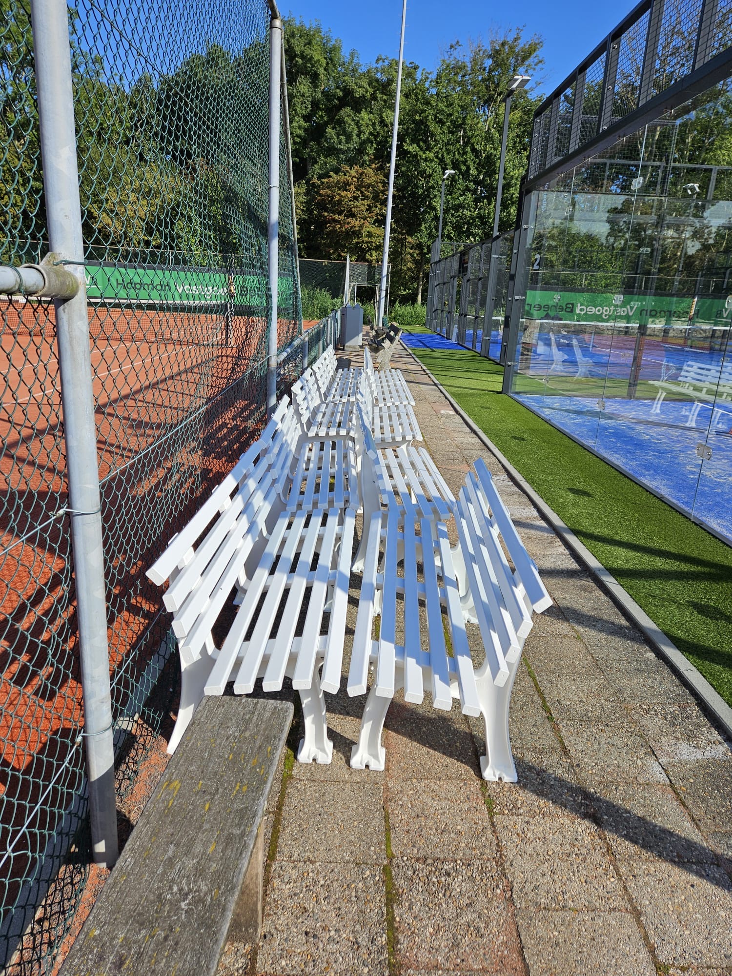 Bij de padelbanen staan nu 10 nieuwe witte bankjes én er is een vrolijke kinder-picknicktafel geplaatst (🙌 bedankt vrijwilligers voor de montage zaterdagochtend).