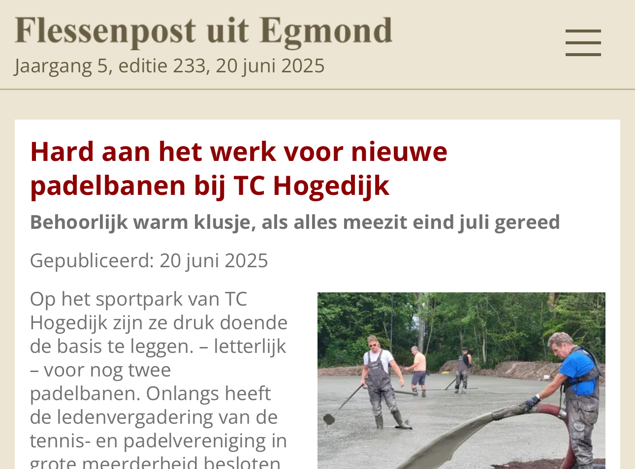 Lees hier het artikel van John de Waard over de aanleg van de nieuwe padelbanen https://flessenpostuitegmond.nl/hard-aan-het-werk-voor-nieuwe-padelbanen-bij-tc-hogedijk/