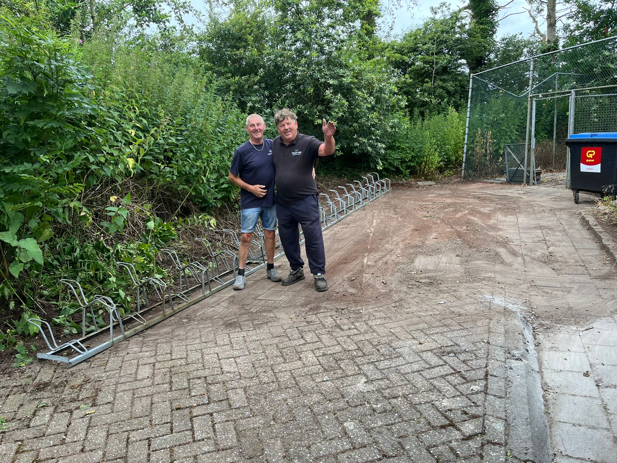 Door de vrijdagochtendploeg is vanmorgen een prachtige nieuwe fietsenstalling gemaakt, zodat er nog meer ruimte is. Dus ietsjes de hoek om en je fiets staat prachtig uit het zicht. Top werk, het park wordt steeds mooier. Zie Sam en Peter glunderen na het harde werken.