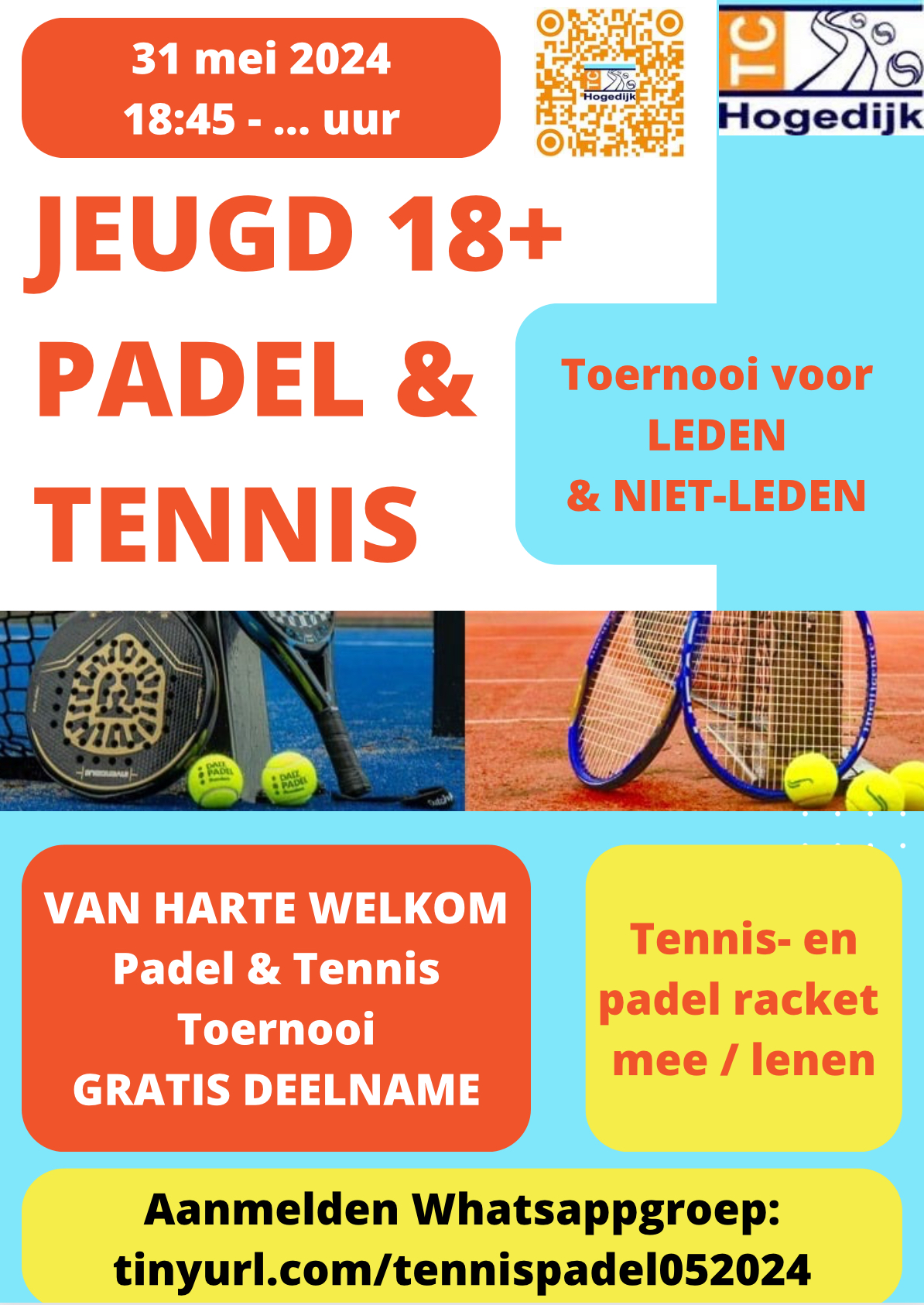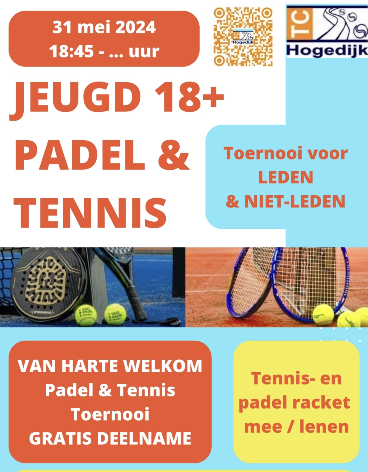 De inschrijving is geopend van het Jeugd 18+ Padel & Tennis Toernooi. Leden zijn van harte welkom, maar je mag ook als niet-lid meedoen. Veel ervaring of weinig ervaring, kom deze avond gezellig meedoen. Er zijn leenrackets beschikbaar.