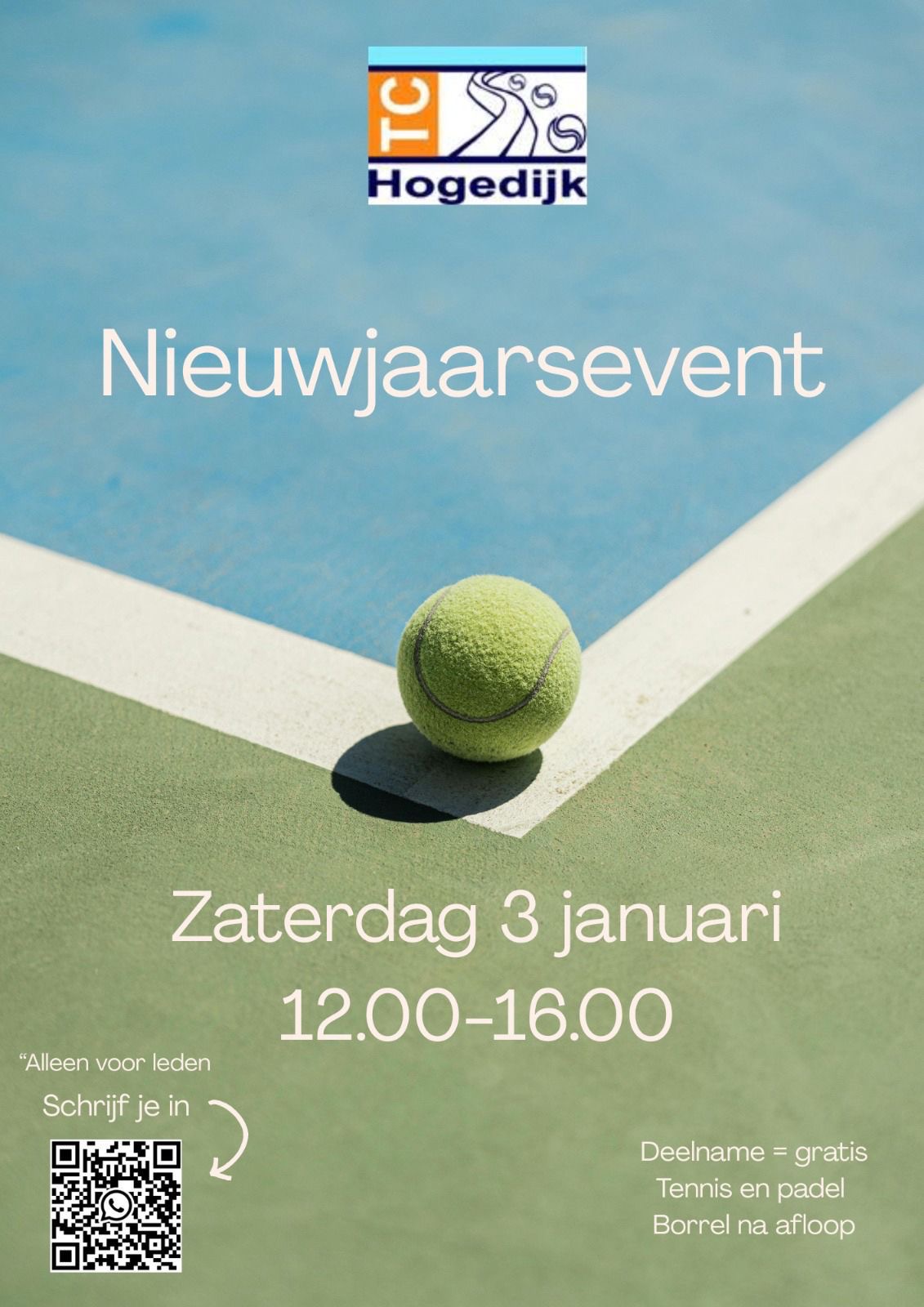 Op zaterdag 3 januari van 12.00-16.00 organiseren we een Nieuwjaars Tennis en Padel middag, gecombineerd met een gezellige nieuwjaarsaftrap 🥂.