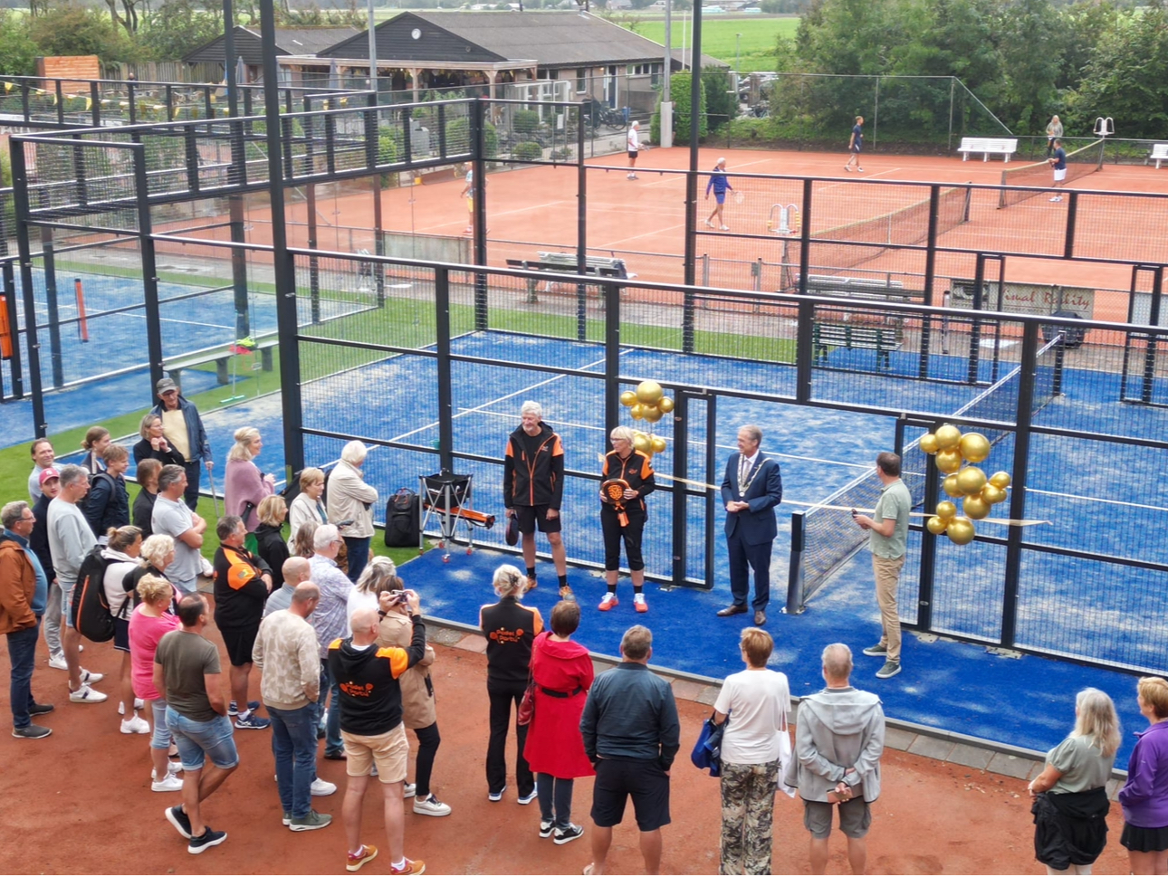 ‘Padel is de snelst groeiende sport’, wist Voskuil bij de openingswoorden te melden. ‘Het is mooi dat op dit toch al fraaie park nu deze twee banen erbij zijn gekomen om aan een stijgende behoefte te kunnen voldoen. Het geeft de vereniging weer een nieuwe dimensie en een mooie toekomst.’ Vervolgens knipte hij het lint door met de woorden ‘hierbij verklaar ik…..’