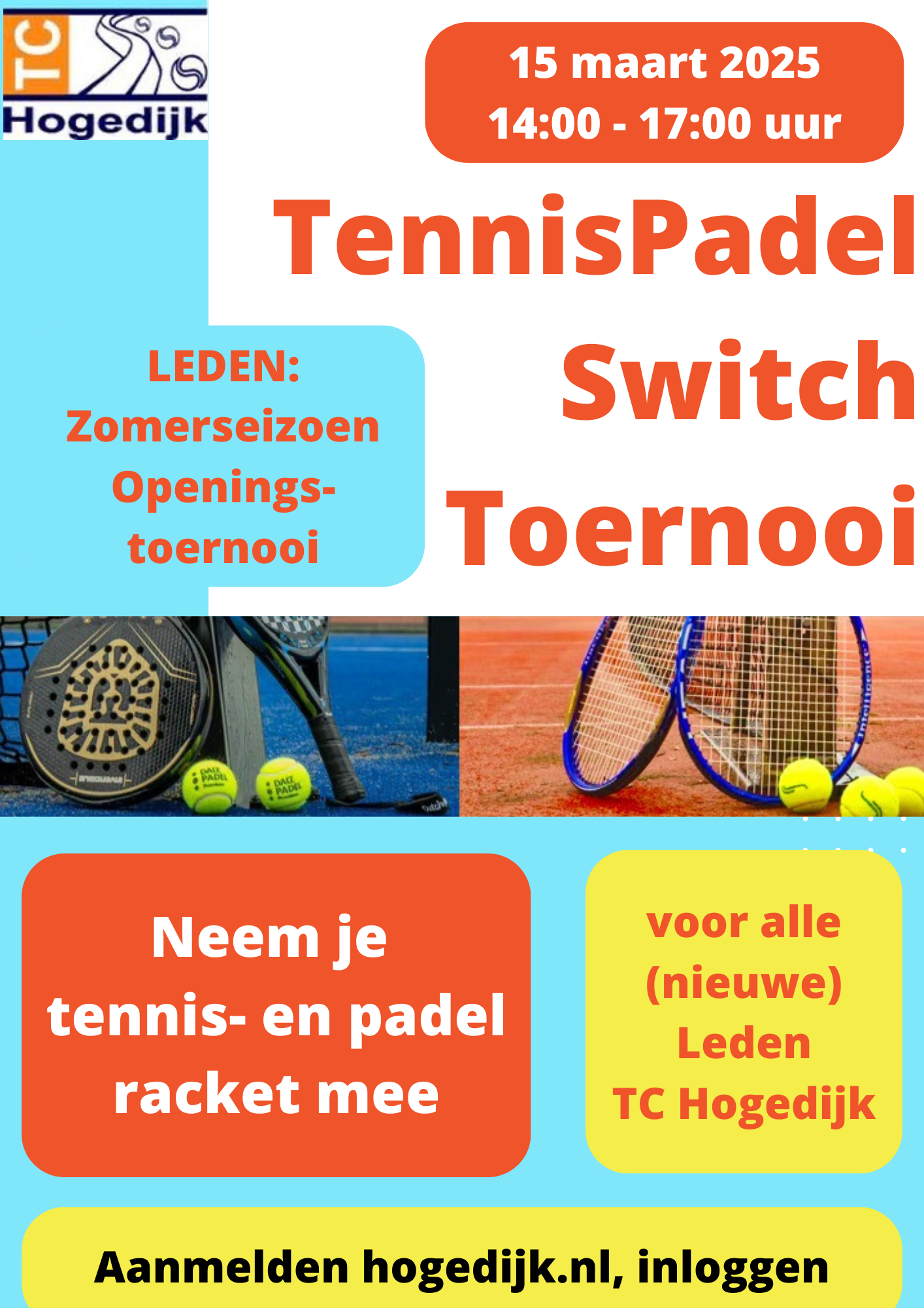 TC Hogedijk organiseert dit jaar een OPENING VAN HET ZOMERSEIZOEN met een TennisPadel Switch Toernooi, alleen voor leden.