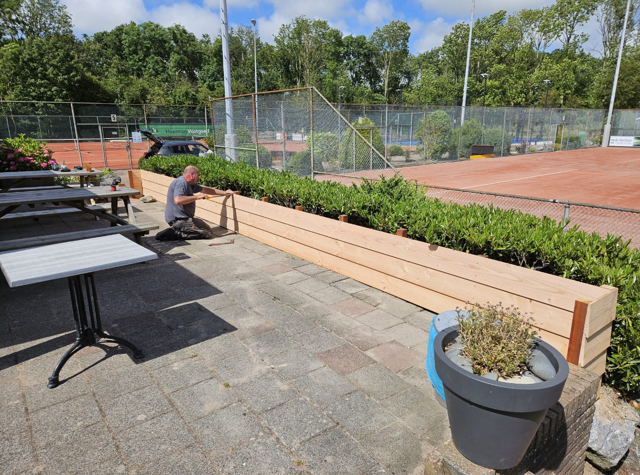 De buxussen die er stonden hadden een ziekte en moesten verwijderd worden. Dat gaf de gelegenheid om het terras meteen iets te vergroten. Met Douglas hout hebben Dirk en Peter een mooie afscheiding gemaakt.